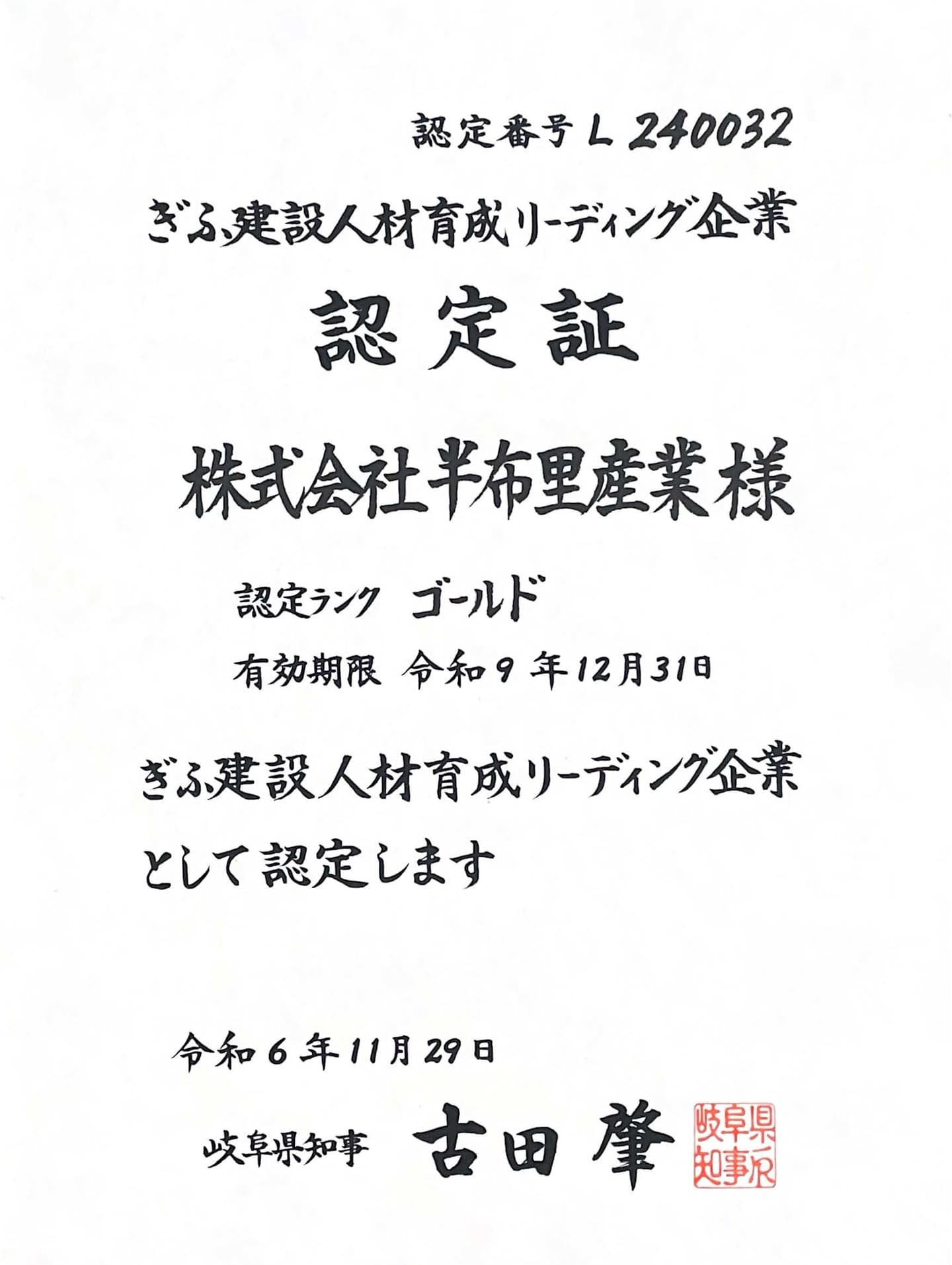 ☑ぎふ建設人材育成リーディング企業に認定されました
